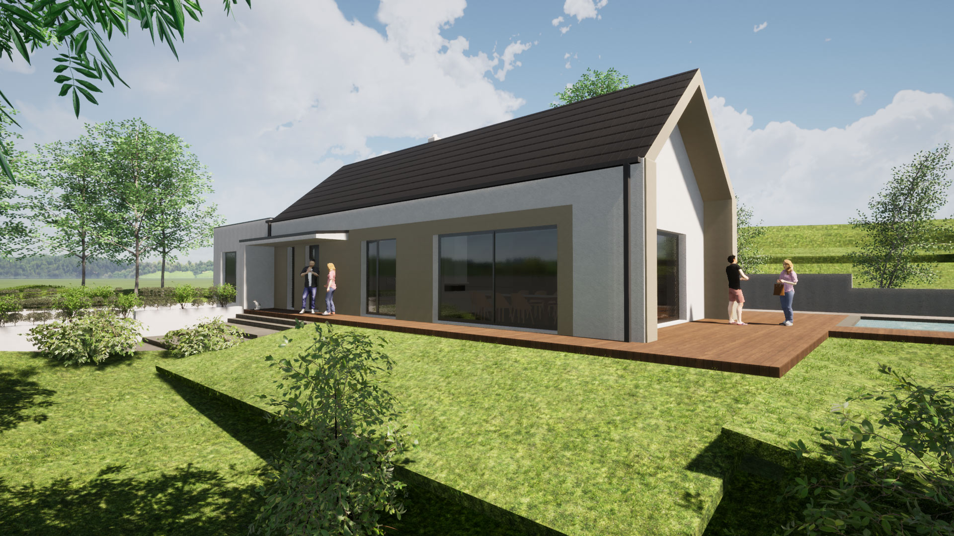 A telek tulajdonosa azzal keresett meg engem, mint építész tervezőt, hogy a telekre egy reprezentatív, am hagyományos, energiatudatos családi házat tervezzek. A cél egy részben lapostetős, részben magastetős, kétszintes lakóépület tervezése volt, mely lehetőség szerint optimálisan a lejtős terep adottságait kihasználva helyezkedik el. Az épület kertkapcsolata a földszinten valósul meg, melyhez nagy alapterületű fedetlen terasz, és a terepadottságoknak megfelelően szinteltolással medence és napozóterasz is tartozik. Az épület előtt vezető járda lehetőséget ad az épület bejáratától a teraszig való körbejárhatóságára burkolt felületen.